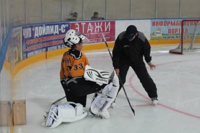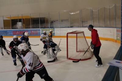 Для вратарей была выделена одна зона. Тренеры Корешков Валерий Петрович и Зубков Владимир Сергеевич объясняли своим подопечным, как двигаться в воротах и правильно отбивать шайбу, летящую выше уровня щитков.