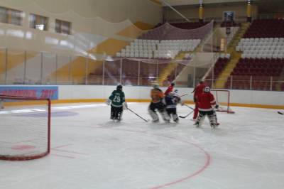 19:45 Средняя и старшая группы заканчивают подготовку на льду. Основой тренировочного процесса являлось умение бросать и забрасывать шайбы.